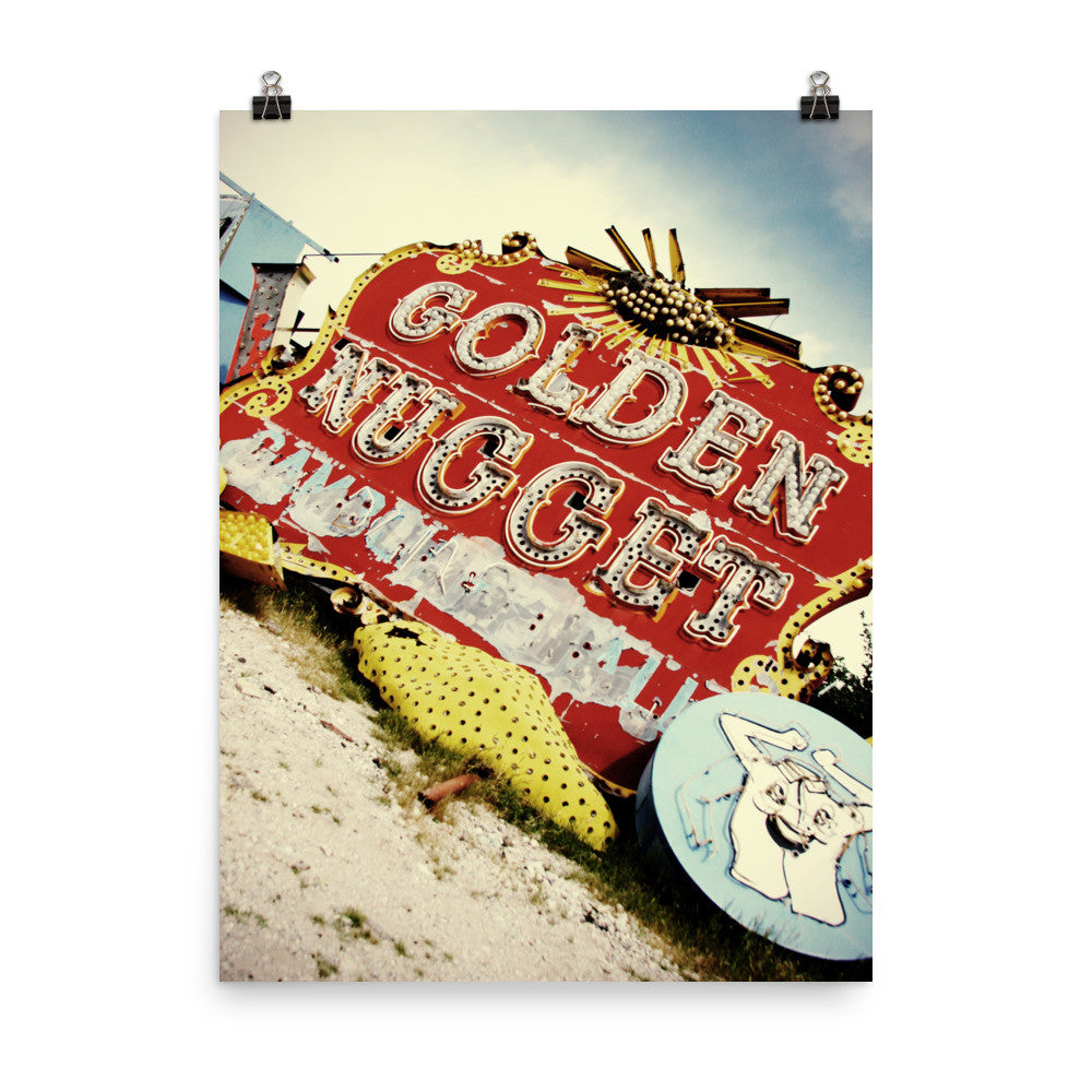 An original photo taken by Jordan Iverson of a vintage Vegas sign of the Golden Nugget. Museum-quality posters made on thick, durable, matte paper.